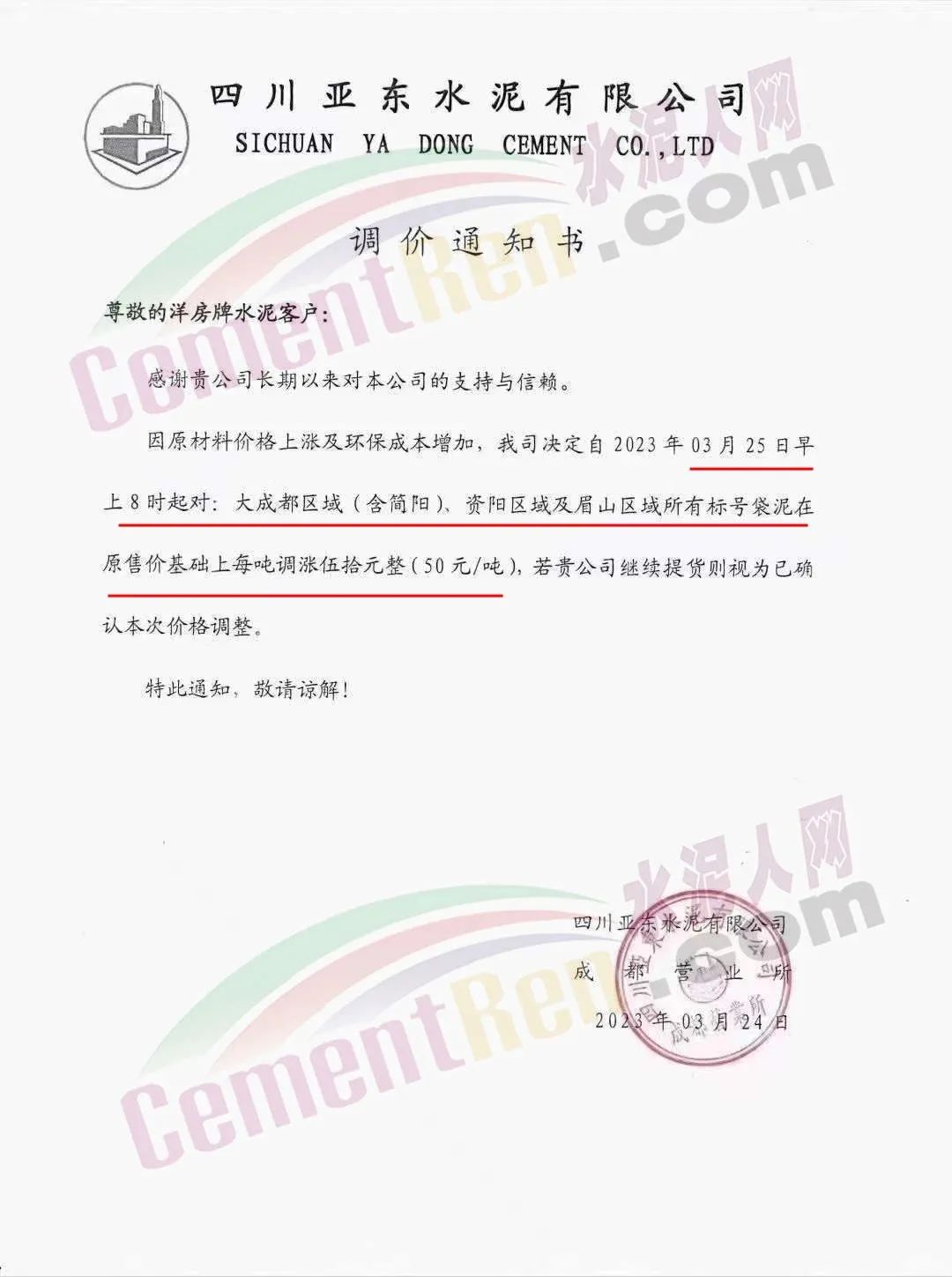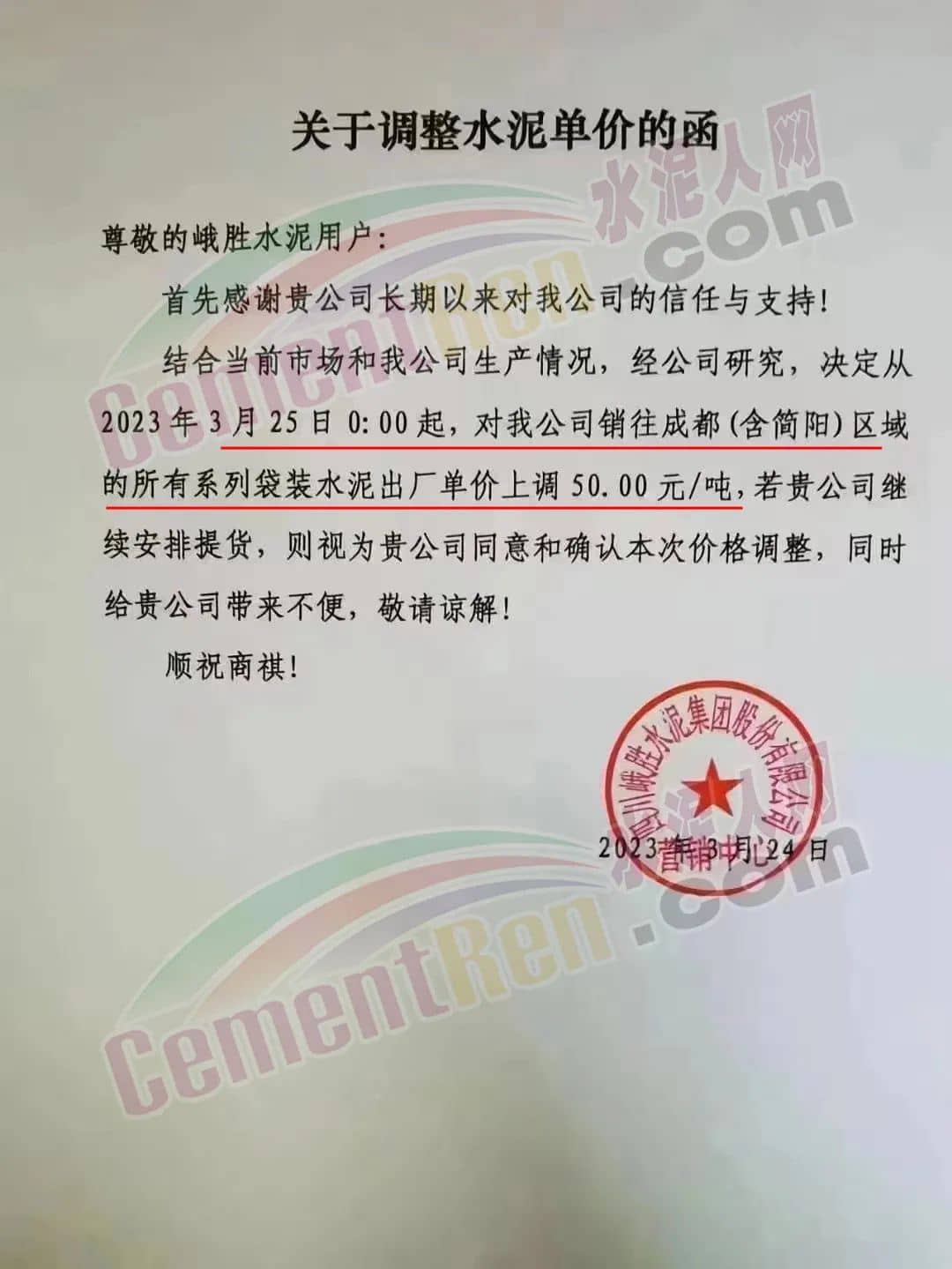 四川峨勝水泥集團股份有限公司通知,結合當前市場和公司生產情況,經公司研究,決定從2023年3月25日0:00起,對銷往成都(含簡陽)區(qū)域的所有系列袋裝水泥出廠單價上調50.00元/噸