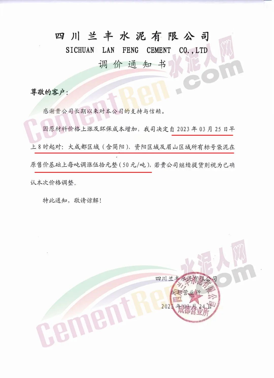 四川蘭豐水泥有限公司通知因原材料價格上漲及環(huán)保成本增加,公司決定自2023年03月25日早上8時起,對大成都區(qū)域(含簡陽)、資陽區(qū)域及眉山區(qū)域所有標號袋泥在原售價基礎上每噸調漲50元/噸。