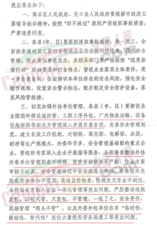 對鋼鐵、氧化鋁、電解鋁、水泥、耐材等生產(chǎn)規(guī)模大、外委環(huán)節(jié)多、安全管理基礎(chǔ)弱的重點企業(yè),要組織專家深入企業(yè)開展指導服務(wù),全面排查整治外協(xié)外委單位管理職責不明確、資質(zhì)資格審查不嚴格、作業(yè)方案審核不認真,安全管理協(xié)議中安全措施不具體,安全技術(shù)交底或安全告知不落實,現(xiàn)場監(jiān)督檢查、協(xié)調(diào)交叉作業(yè)不到位未將相關(guān)方納入企業(yè)一體化管理等突出問題。