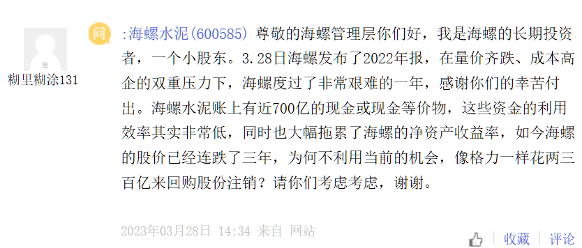 另有一位海螺的長期投資者表示:海螺水泥2022年在量價齊跌、成本高企的雙重壓力下,海螺度過了非常艱難的一年,感謝你們的辛苦付出。海螺水泥賬上有近700億的現(xiàn)金或現(xiàn)金等價物,這些資金的利用效率其實非常低,同時也大幅拖累了海螺的凈資產(chǎn)收益率,如今海螺的股價已經(jīng)連跌了三年,為何不利用當(dāng)前的機(jī)會,像格力一樣花兩三百億來回購股份注銷?