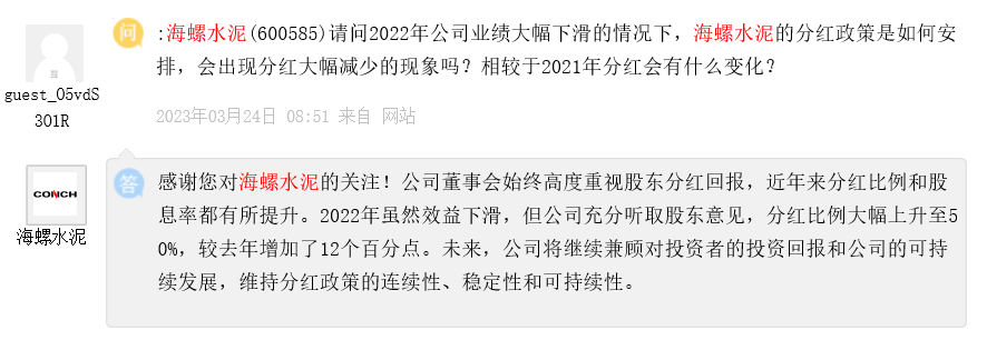 海螺水泥回復(fù)稱,“十四五”期間,公司將堅定主業(yè)發(fā)展信心不動搖,做強(qiáng)做優(yōu)水泥主業(yè)及上下游產(chǎn)業(yè)鏈,推動環(huán)保、新能源、數(shù)字產(chǎn)業(yè)協(xié)調(diào)發(fā)展,以綠色低碳可持續(xù)發(fā)展為目標(biāo),加大在減污降碳、節(jié)能降耗上的研發(fā)和投入。公司董事會一直以來高度重視股東分紅回報,近年來分紅比例和股息率都有所提升。2022年雖然效益下滑,但公司充分聽取股東意見,分紅比例大幅上升至50%,較去年增加了12個百分點(diǎn)。