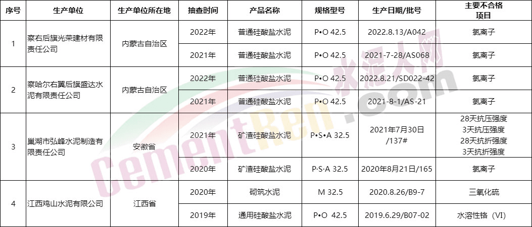 2020~2022年國抽水泥產品不合格名單發(fā)布,共77批次不合格