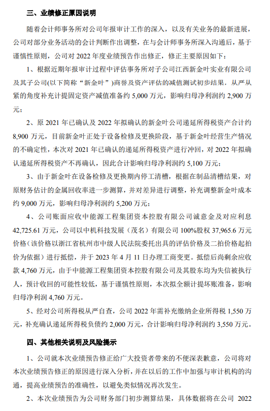 金圓股份還提到公司賬面應(yīng)收中能源工程集團(tuán)資本控股有限公司誠意金及對應(yīng)利息42725.61萬元,公司以中機(jī)科技發(fā)展(茂名)有限公司100%股權(quán)37965.6萬元價格進(jìn)行抵償,并于2023年4月11日辦理工商變更。抵償后尚剩余應(yīng)收款4760萬元,由于中能源工程集團(tuán)資本控股有限公司及其股東均為失信被執(zhí)行人,預(yù)計收回的可能性較低,基于謹(jǐn)慎性原則,本次擬全額計提壞賬準(zhǔn)備,影響歸母凈利潤4760萬元。