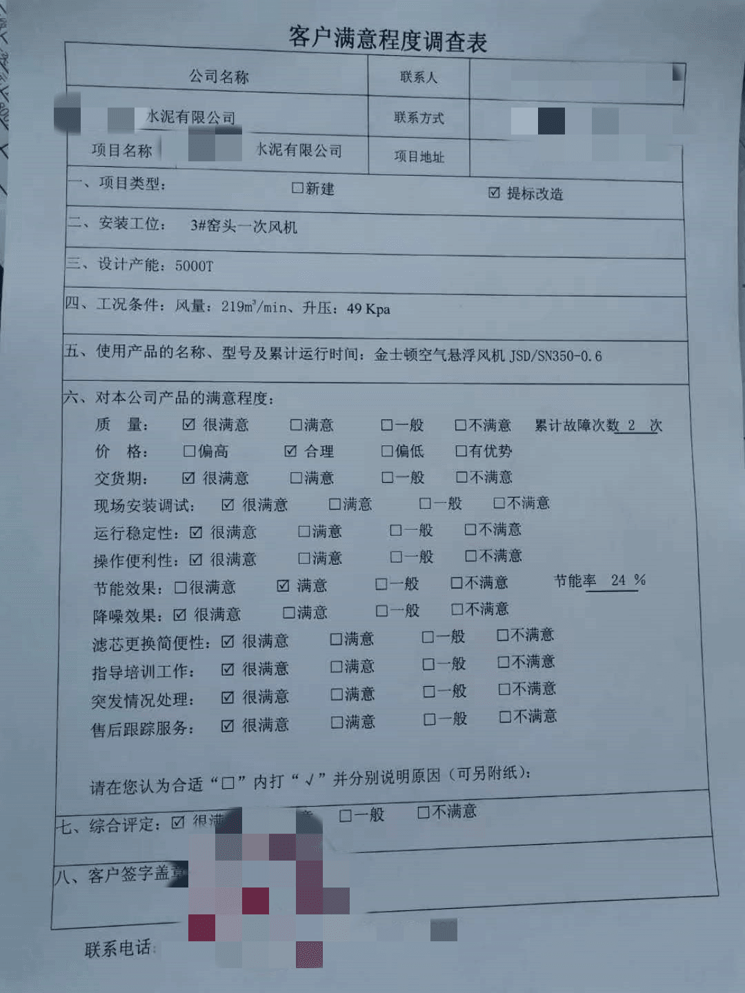 經(jīng)過一段時間運行,水泥廠聯(lián)合金士頓雙方對空氣懸浮風機進行檢查驗收,發(fā)現(xiàn)窯尾送煤空氣懸浮風機滿足試用考核指標:平均節(jié)電率為 39.05%,節(jié)能效果明顯,風機運行噪音監(jiān)測值最高為77dB,達到預期效果(節(jié)電率≥31%,噪音≤80dB)。