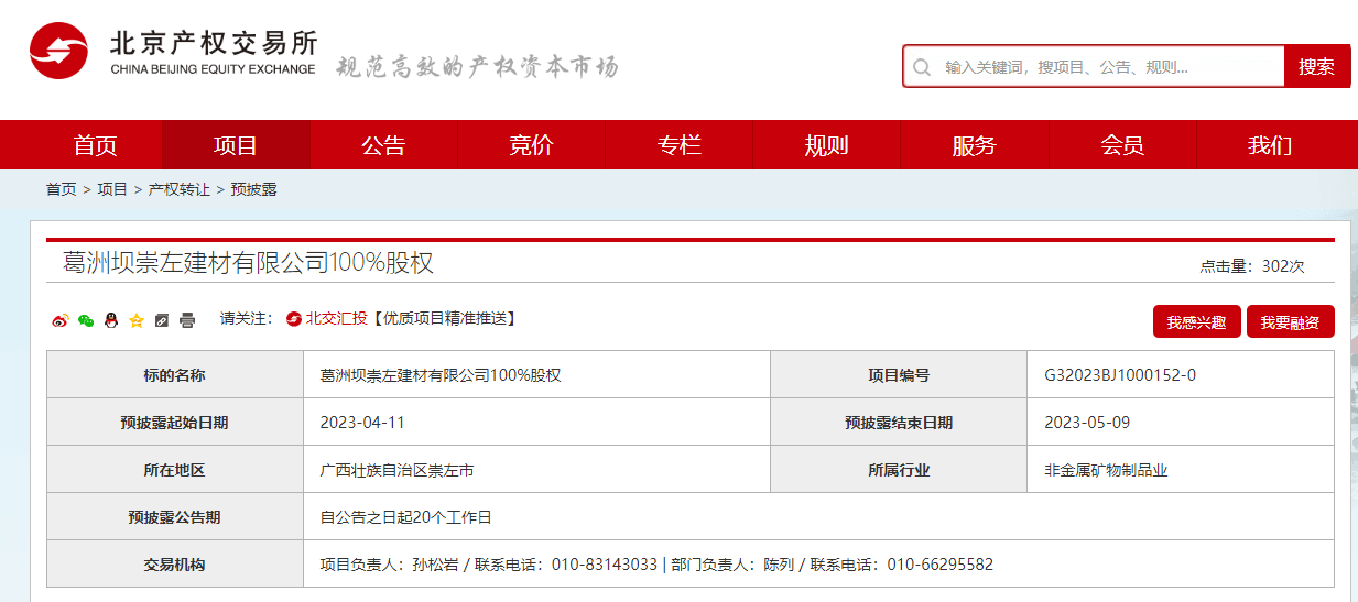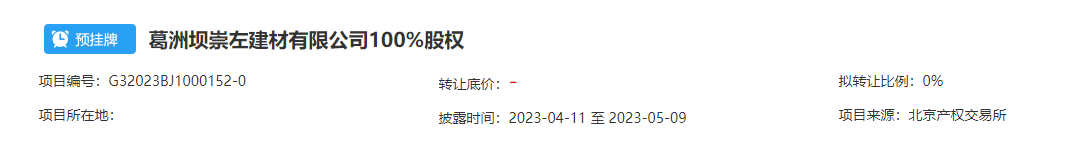 葛洲壩崇左建材有限公司100%股權預掛牌,披露結(jié)束日期為2023年5月9日。企業(yè)2023年3月31日財務報表顯示,資產(chǎn)總計27936.07萬元,負債總計27836.07萬元,所有者權益100萬元。
