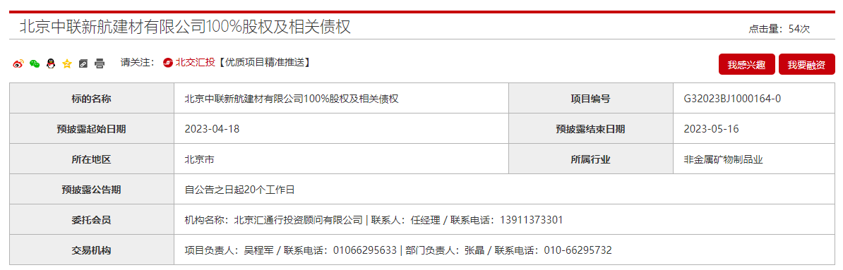 中國聯(lián)合水泥集團有限公司旗下北京中聯(lián)新航建材有限公司100%股權及相關債權擬出讓。企業(yè)經(jīng)營范圍為制造混凝土、預拌砂漿;銷售建筑材料、混凝土添加劑、土砂石、尾礦石、山碎石;技術開發(fā);技術咨詢;機械設備租賃。