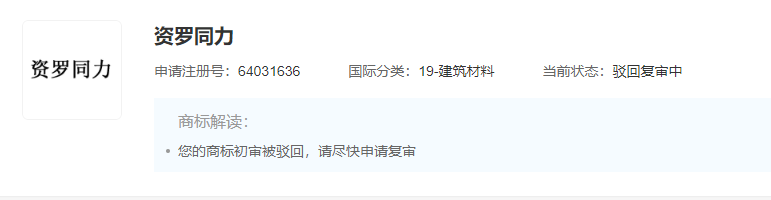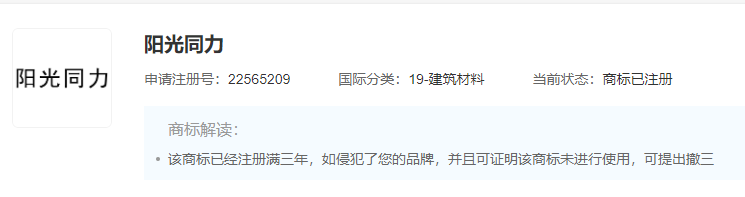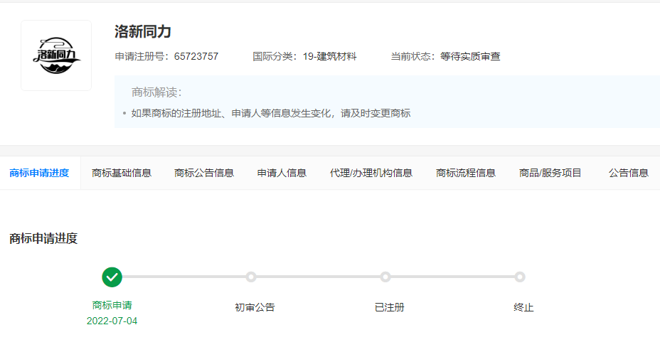 “洛新同力”,商標申請人為洛陽畔山水泥有限公司。2023年2月10日商標注冊申請被駁回,當前狀態(tài)為等待實質(zhì)審查。