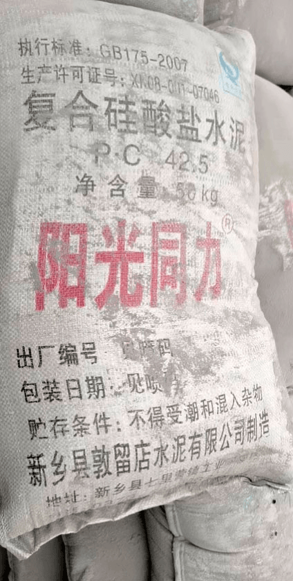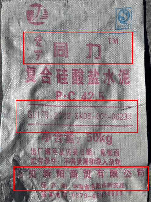 標稱品牌“陽光同力”,商標已注冊,生產(chǎn)許可證在有效期內(nèi)。產(chǎn)品外包裝可見,生產(chǎn)許可證編號:XK08-001-07046;制造企業(yè):新鄉(xiāng)縣敦留店水泥有限公司;地址:新鄉(xiāng)縣七里營鎮(zhèn)。