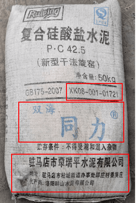 標稱為“洛新同力”的包裝水泥,外包裝生產(chǎn)許可證編號為XK08-001-05206。該編號為洛陽畔山水泥有限公司于2016年5月12日領(lǐng)到的證書,該證書已于2021年5月11日到期。洛陽畔山水泥有限公司新領(lǐng)生產(chǎn)許可證編號為(豫)XK08-001-00030。