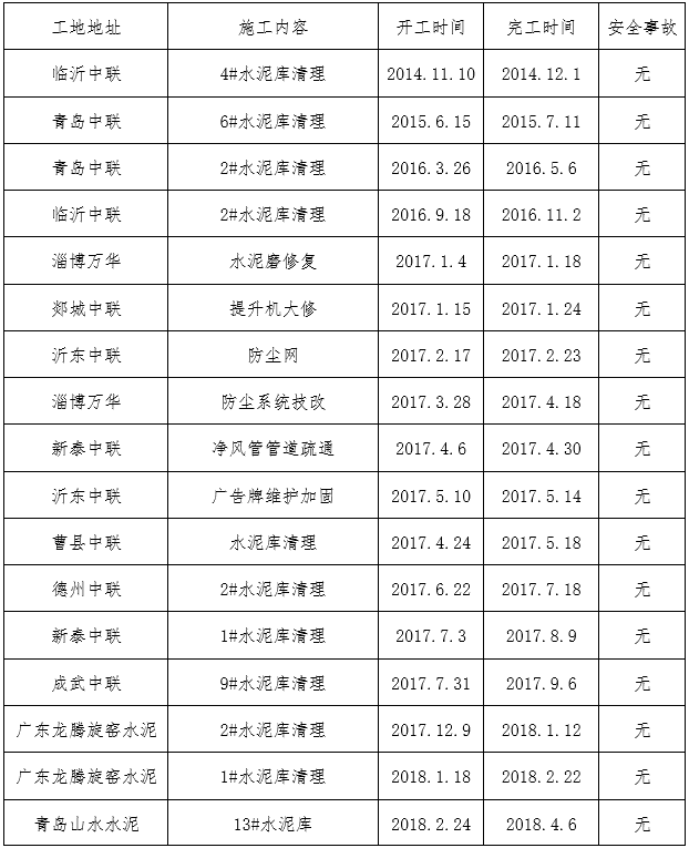 鑫盛利水泥倉(cāng)智能機(jī)械清理有限公司業(yè)績(jī)表
