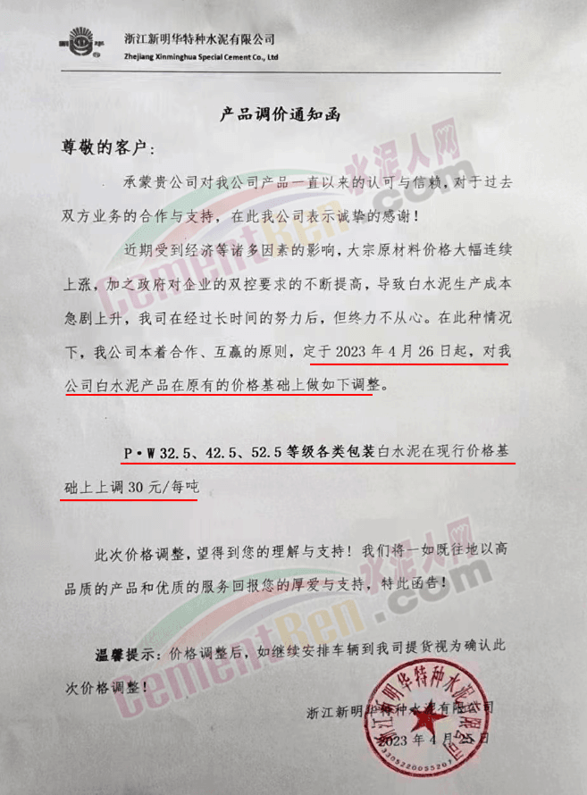 江西銀杉公司通知鑒于近期白水泥生產(chǎn)的綜合成本大幅度上漲,經(jīng)公司研究決定,自2023年4月27日0時起,所有白水泥產(chǎn)品在現(xiàn)行價格基礎(chǔ)上上調(diào)30元/噸。