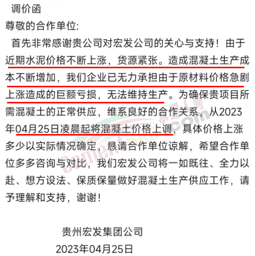 同區(qū)域下游商砼公司發(fā)布通知稱,由于水泥漲價,貨源緊張。造成混凝土生產(chǎn)成本增加,企業(yè)已無力承擔(dān)由于原材料價格急劇上漲造成的巨額虧損,無法維持生產(chǎn)。為確保項目所需混凝土的正常供應(yīng),上調(diào)混凝土價格。