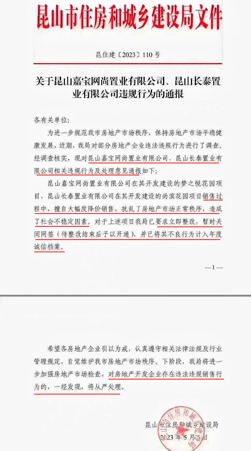 日前,江蘇蘇州昆山住建局在微信群發(fā)布一則通報(bào)文件,兩家房企因在售房過(guò)程中,擅自大幅度降價(jià)銷(xiāo)售,擾亂了房地產(chǎn)市場(chǎng)正常秩序被處罰。