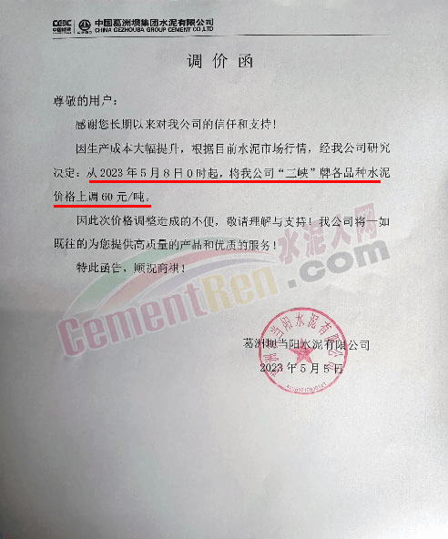 據(jù)了解,自年初以來(lái)水泥市場(chǎng)波動(dòng)頻繁,部分區(qū)域水泥價(jià)格已然觸底。5月5日葛洲壩當(dāng)陽(yáng)水泥有限公司通知稱,因生產(chǎn)成本大幅提升,根據(jù)目前水泥市場(chǎng)行情,經(jīng)公司研究決定從2023年5月8日0時(shí)起,將公司“三峽”牌各品種水泥價(jià)格上調(diào)60元/噸。