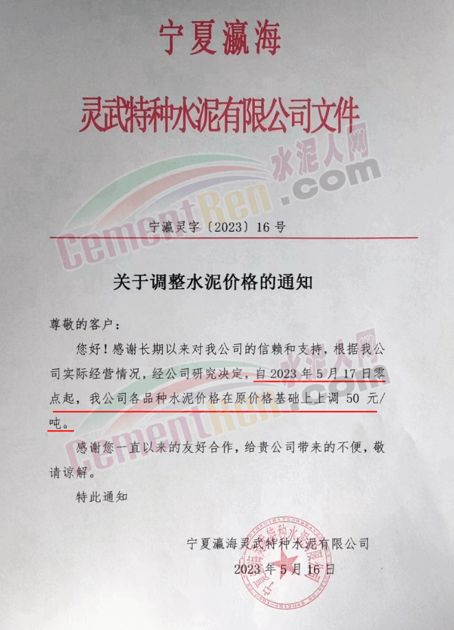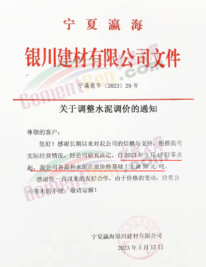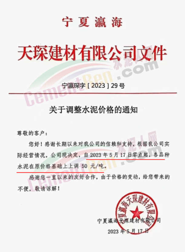 寧夏瀛海天琛建材有限公司通知,根據(jù)公司實際經(jīng)營情況,現(xiàn)決定,自2023年5月17日零點起,各品種水泥在原價格基礎(chǔ)上上調(diào)50元/噸。