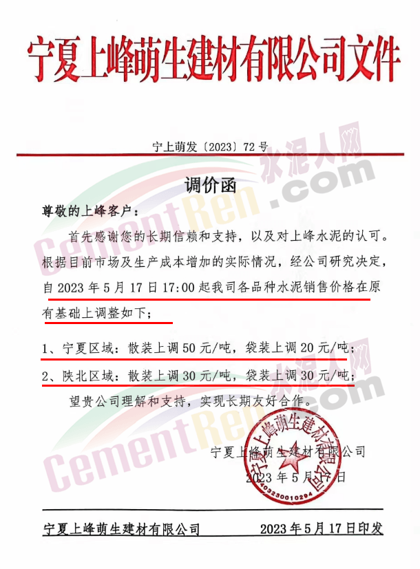 寧夏上峰萌生建材有限公司通知根據(jù)目前市場及生產(chǎn)成本增加的實際情況,經(jīng)公司研究決定自5月17日17時起公司各品種水泥銷售價格在原有基礎(chǔ)上調(diào)整。其中寧夏區(qū)域:散裝上調(diào)50元/噸,袋裝上調(diào)20元/噸;陜北區(qū)域:散裝上調(diào)30元/噸,袋裝上調(diào)30元/噸。