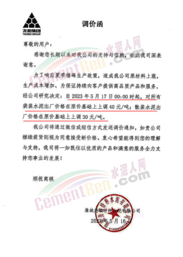 同日,蒲城堯柏特種水泥有限公司通知,為了響應(yīng)夏季錯峰生產(chǎn)政策,造成公司原材料上漲,生產(chǎn)成本增加,為保證持續(xù)向客戶提供高品質(zhì)產(chǎn)品和服務(wù)。經(jīng)公司研究決定:自5月17日0時起,對所有袋裝水泥出廠價格在原價基礎(chǔ)上上調(diào)40元/噸;散裝水泥出廠價格在原價基礎(chǔ)上上調(diào)30元/噸。