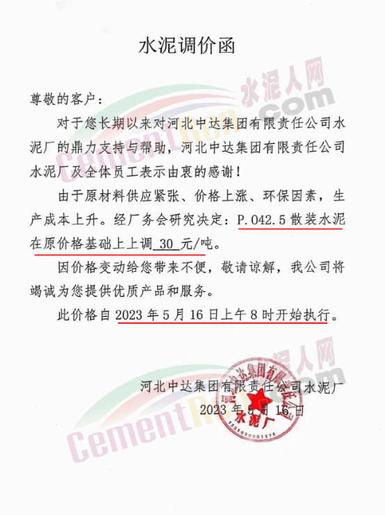 河北中達集團有限責(zé)任公司水泥廠通知,由于原材料供應(yīng)緊張、價格上漲、環(huán)保因素,生產(chǎn)成本上升,經(jīng)廠務(wù)會研究決定,自5月16日起P.O42.5散裝水泥上調(diào)30元/噸。