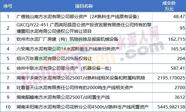 10個已成交項目中,除廣西賓陽縣昆侖資產投資發(fā)展有限責任公司持有的黎塘暨陽水泥有限公司債權公開轉讓及紹興萬年青水泥有限公司20%股權轉讓外,其他均為機器設備或生產線閑置資產。且主要為中國建材集團旗下南方水泥、天山水泥、中聯(lián)水泥等企業(yè)閑置資產。