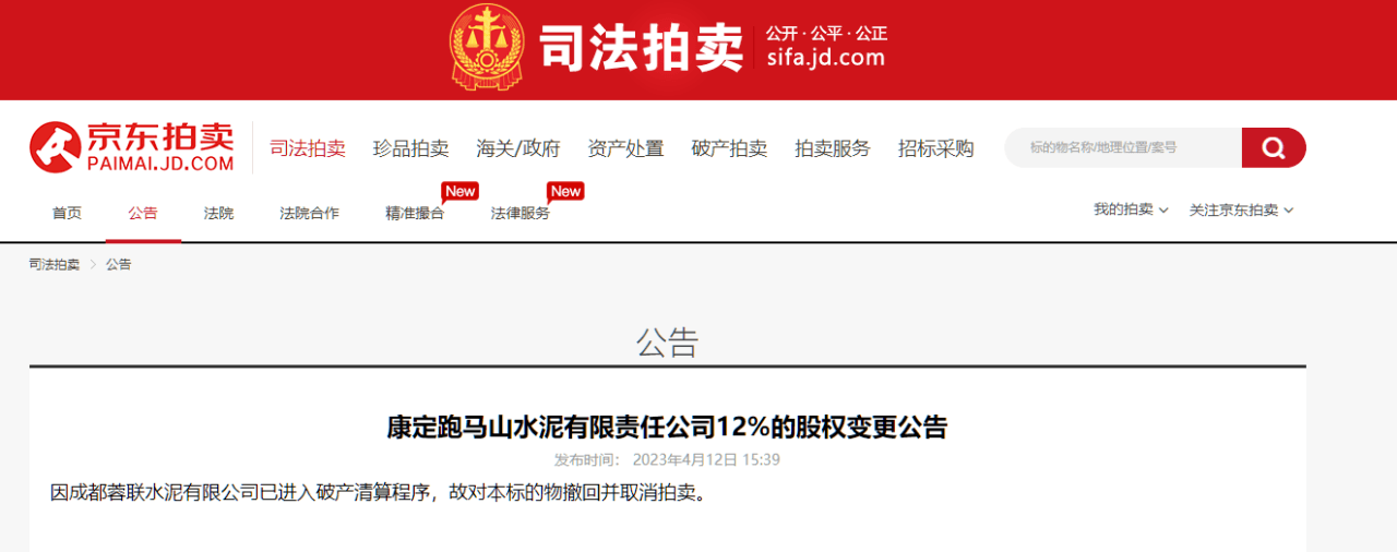 從京東司法拍賣平臺可見,成都蓉聯(lián)水泥有限公司已進入破產清算程序,故對本標的物撤回并取消拍賣。