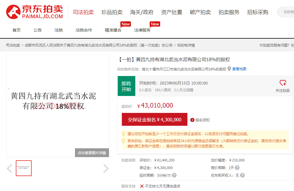 3月29日,成都市雙流區(qū)人民法院發(fā)布拍賣公告(川0116執(zhí)恢64號)提到定于5月4日10時至5月5日10時在京東網司法拍賣網絡平臺公開拍賣涉案財產。拍賣財產為康定跑馬山水泥有限責任公司12%的股權,起拍價2478萬元。