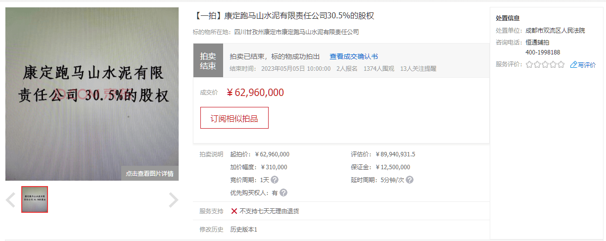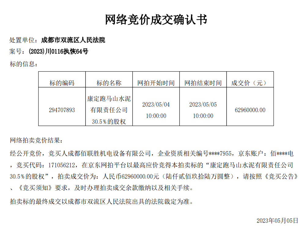 同期,康定跑馬山水泥有限責任公司30.5%的股權于5月5日被成功拍出,并未受到成都蓉聯(lián)水泥有限公司破產的影響。成交確認書顯示,經公開競價,競買人成都佰聯(lián)勝機電設備有限公司在京東網拍平臺以最高價競得本拍賣標的,拍賣成交價為6296萬元。