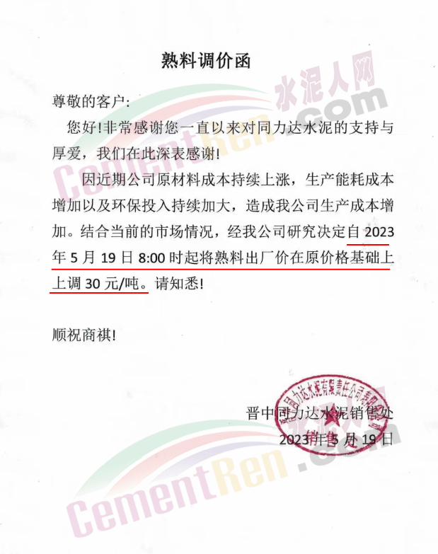 晉中同力達(dá)水泥銷售處通知,因近期公司原材料成本持續(xù)上漲,生產(chǎn)能耗成本增加以及環(huán)保投入持續(xù)加大,造成公司生產(chǎn)成本增加。結(jié)合當(dāng)前的市場情況,經(jīng)公司研究決定自5月19日8時(shí)起將熟料出廠價(jià)在原價(jià)格基礎(chǔ)上上調(diào)30元/噸。