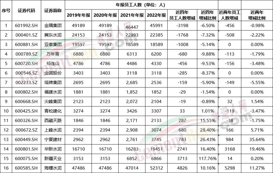 2021~2022年金隅集團、冀東水泥、萬年青、祁連山、塔牌集團、青松建化等均有百人以上的減員,冀東水泥減員達500多人 。