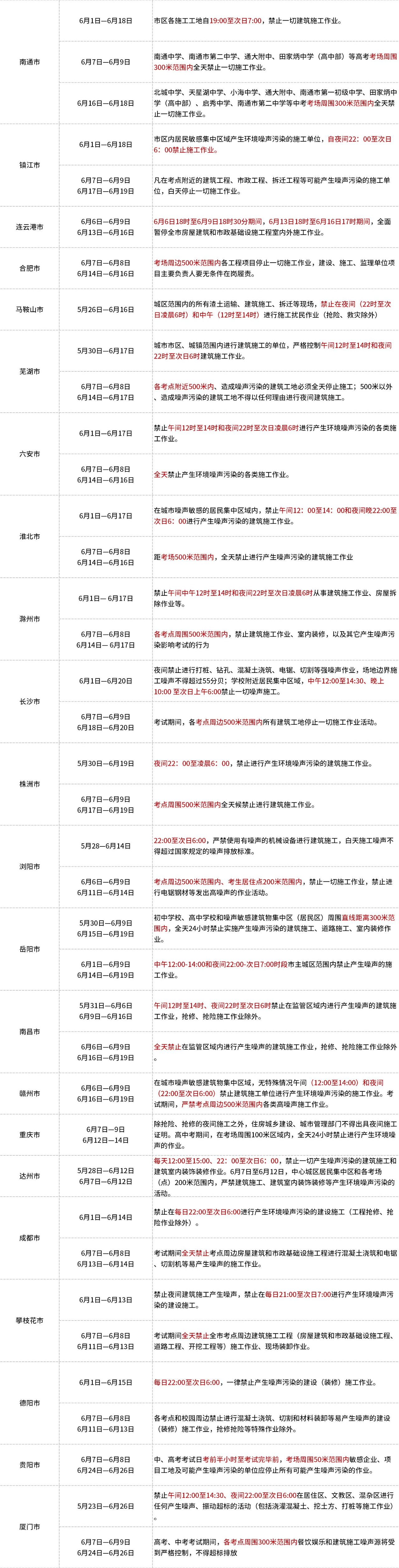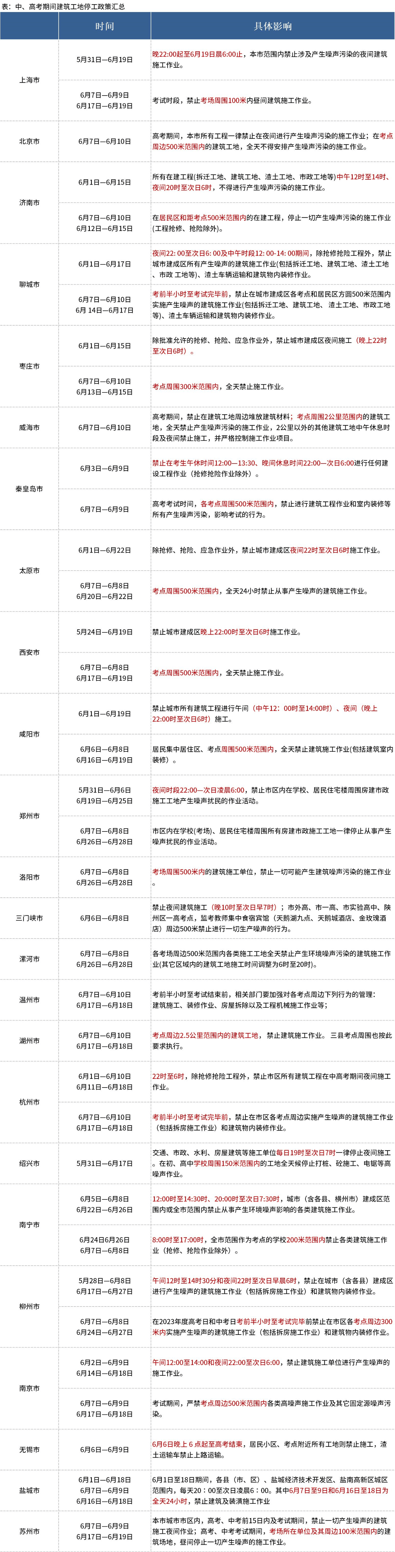 據(jù)市場(chǎng)反饋,為給廣大中、高考學(xué)生創(chuàng)造一個(gè)良好的復(fù)習(xí)迎考和考試環(huán)境,各地紛紛發(fā)出通知對(duì)所有建筑工地加強(qiáng)監(jiān)管工作。截至6月7日,共有57個(gè)城市發(fā)布了建筑工地停工最新政策。