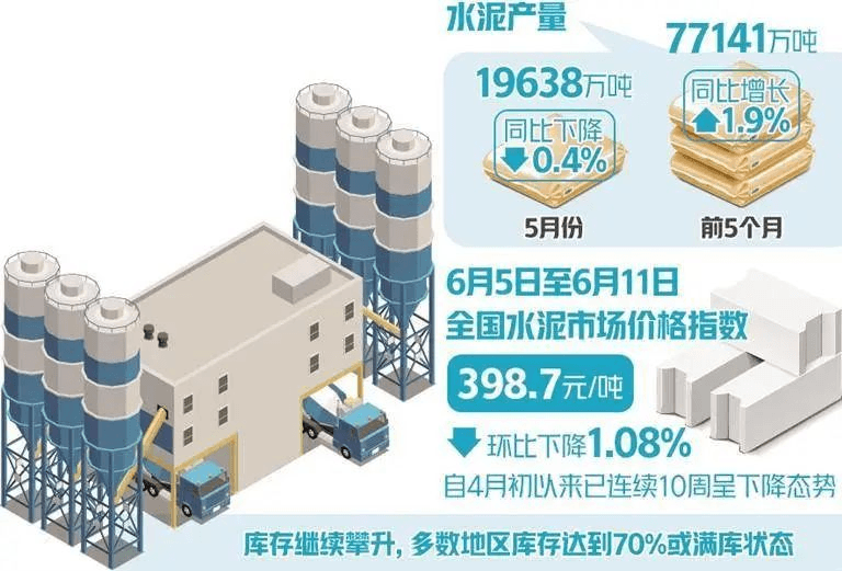 進(jìn)入6月以來(lái),受降雨、工程項(xiàng)目資金緊張等因素影響,水泥成交量大幅下滑,各企業(yè)庫(kù)存壓力增大。全國(guó)水泥庫(kù)容比達(dá)75.81%,部分區(qū)域企業(yè)庫(kù)存達(dá)到100%。