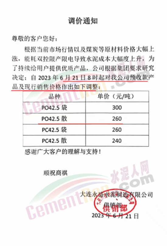 大連永盛水泥制造有限公司通知稱,根據(jù)當(dāng)前市場(chǎng)行情以及煤炭等原材料價(jià)格大幅上漲,能耗雙控限產(chǎn)限電導(dǎo)致水泥成本大幅度上升,為了持續(xù)給用戶提供優(yōu)質(zhì)產(chǎn)品,公司根據(jù)集團(tuán)要求研究決定,自2023年6月21日8時(shí)起對(duì)公司預(yù)收款產(chǎn)品及現(xiàn)行銷售價(jià)格作出如下調(diào)整。調(diào)整后PO42.5散報(bào)價(jià)260元/噸。