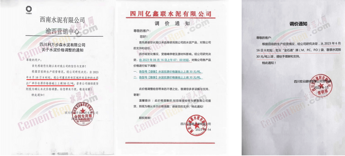 重慶區(qū)域南桐特種水泥、青鵬水泥、銅梁西南水泥、利萬(wàn)步森水泥、億鑫聯(lián)水泥、宏云建材等主要品牌企業(yè)復(fù)價(jià)上調(diào)30~50元/噸。