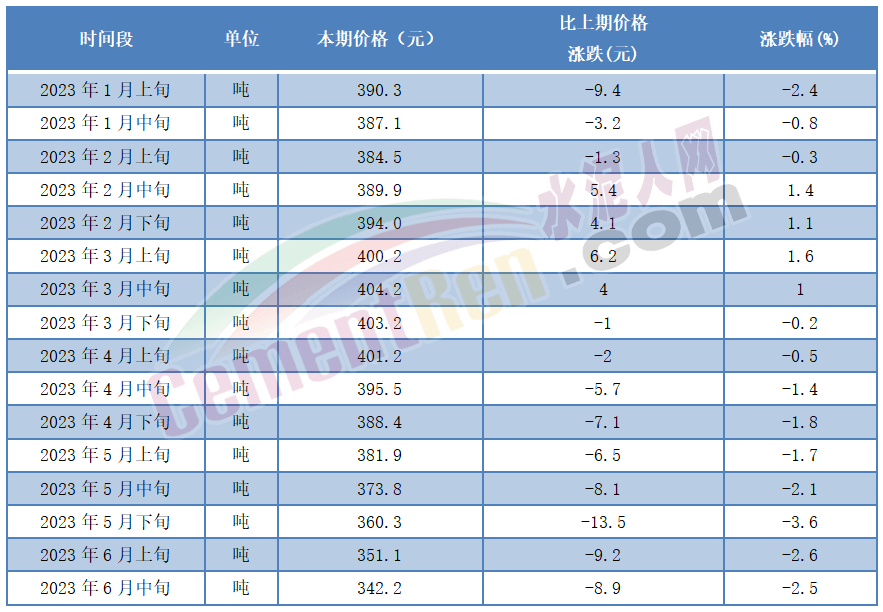 廣西區(qū)域某品牌企業(yè)銷售負(fù)責(zé)人表示:淡季市場(chǎng)“全國(guó)統(tǒng)一”行情。從國(guó)家統(tǒng)計(jì)局近日發(fā)布的2023年6月中旬流通領(lǐng)域水泥市場(chǎng)價(jià)格變動(dòng)情況可見,雖煤炭?jī)r(jià)格出現(xiàn)小幅回升,但水泥價(jià)格仍持續(xù)下跌,P.O42.5散裝水泥較6月上旬下跌8.9元/噸,又一次刷新近五年來的價(jià)格最低點(diǎn)。