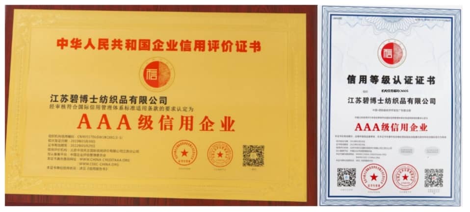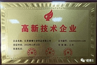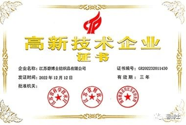 近日,江蘇碧博士紡織品有限公司(以下簡稱“碧博士”)成功獲得國家“高新技術企業(yè)”認定殊榮,正式邁入國家高新技術企業(yè)行列。本次成功入選高新技術企業(yè),是國家相關部門對碧博士多年來工作的肯定,也是碧博士產(chǎn)品研發(fā)實力與創(chuàng)新能力的體現(xiàn)。