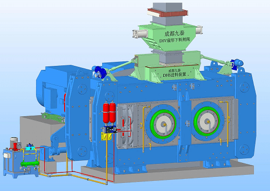 輥壓機負(fù)荷運行中,兩輥間物料的連續(xù)性和密閉性對輥壓機的穩(wěn)定運行至關(guān)重要,直接影響輥壓機效率的發(fā)揮。長期以來,輥壓機在生產(chǎn)環(huán)節(jié)中,往往忽視了料床對輥壓機的影響,輥間物料溢散,循環(huán)負(fù)荷大,設(shè)備磨損加劇,而輥壓機效率不高,導(dǎo)致能耗居高不下,嚴(yán)重影響經(jīng)濟指標(biāo)。新型的進料裝置---DHS弧形進料裝置完美的解決了這個問題。