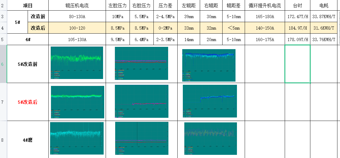 例: 水泥粉磨生產(chǎn)線,均為160-140輥壓機+Φ4.8m×9.5m管磨機組成的聯(lián)合粉磨系統(tǒng)。改造前,輥壓機動定輥運行電流大多時間在95A以下,兩側(cè)壓力差大,輥縫偏差大時達到18mm,系統(tǒng)粉磨電耗高,產(chǎn)量低。分析認(rèn)為,根本原因出在輥壓機系統(tǒng),表現(xiàn)為輥壓機喂料裝置喂料不穩(wěn)定,液壓系統(tǒng)和電氣控制的功能發(fā)揮存在不足。