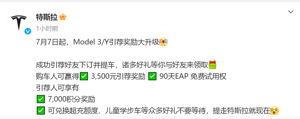 雖然中國(guó)汽車(chē)工業(yè)協(xié)會(huì)發(fā)布聲明從承諾書(shū)中刪除涉及“價(jià)格”表述,但在一些行業(yè)人士看來(lái),價(jià)格戰(zhàn)是商業(yè)主體競(jìng)爭(zhēng)的市場(chǎng)行為,汽車(chē)行業(yè)也不例外,諷刺的是,剛剛簽訂了協(xié)議,新能源汽車(chē)領(lǐng)軍者特斯拉于簽訂協(xié)議次日(7日)變相降價(jià),7月7日起升級(jí)Model 3/Y引薦獎(jiǎng)勵(lì)。成功引薦好友下訂并提車(chē),購(gòu)車(chē)人可獲得3500元引薦獎(jiǎng)勵(lì)(可用于抵扣車(chē)輛尾款),90天EAP免費(fèi)試用權(quán),引薦人可享7000積分獎(jiǎng)勵(lì)、可兌換超充額度、兒童學(xué)步車(chē)等。