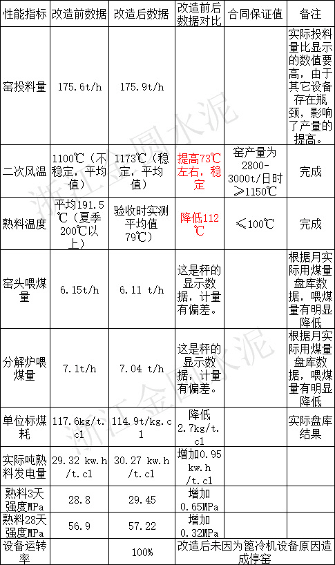 改造施工工程歷時30 天,經(jīng)過一段時間的運行及調(diào)試消缺,該設備運轉正常,各工藝參數(shù)穩(wěn)定,目前窯產(chǎn)量能連續(xù)穩(wěn)定達到2800-3000T/D(因其它因素的影響,提產(chǎn)方面尚有瓶頸),取得的節(jié)能指標十分明顯。經(jīng)金圓水泥設備部、生產(chǎn)部、安環(huán)部等大半年的運行評審與考核,所有改造的預期目標全部達到,實際運行指標均超過合同考核標準。