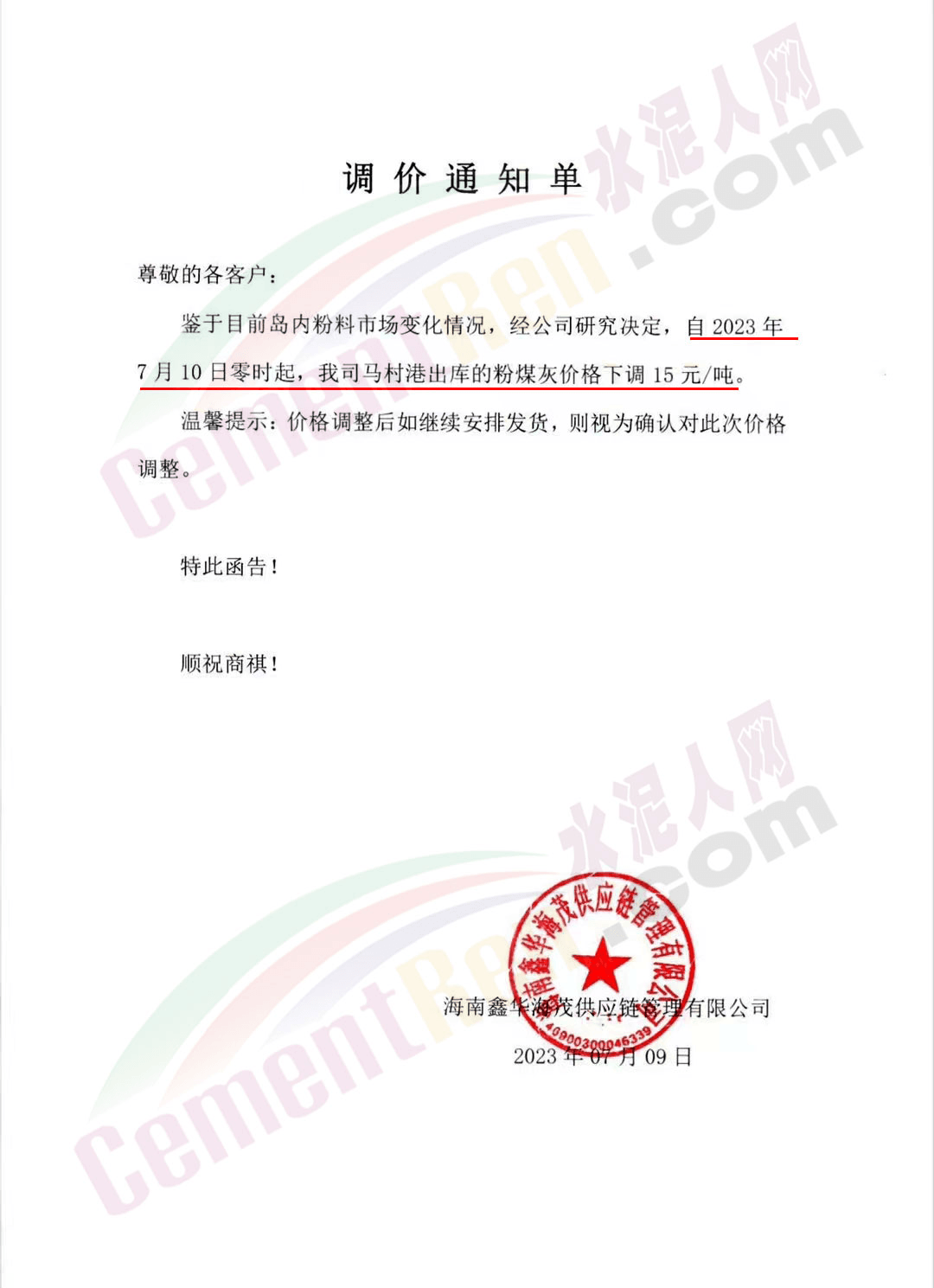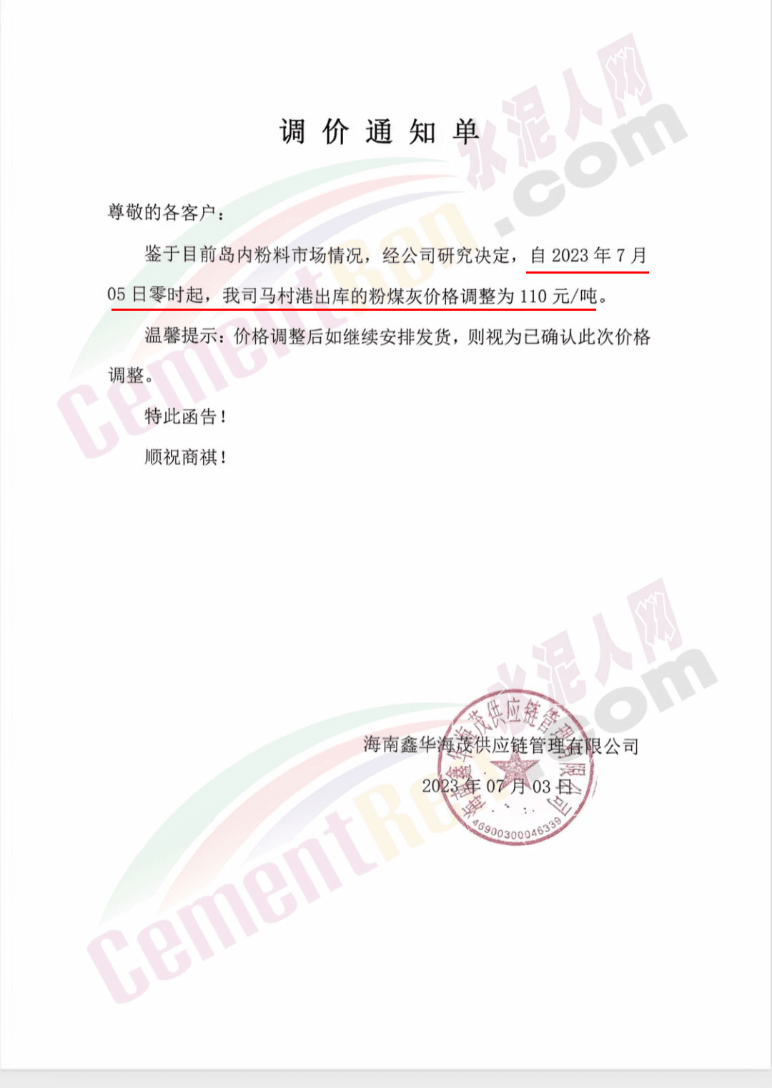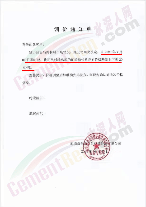 “天涯‘牌水泥通知,自2023年7月8日零時起所有品種水泥在出廠價格基礎(chǔ)上上調(diào)30元/噸,同期調(diào)整粉煤灰及礦渣粉報(bào)價。
