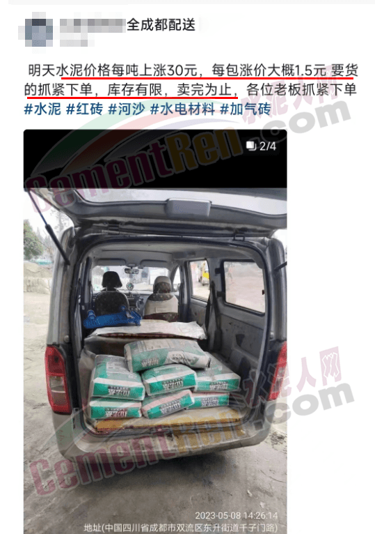 另有成都經(jīng)銷商通知:每噸漲30元,每包漲約1.5元,要貨的抓緊下單,庫存有限,賣完為止……