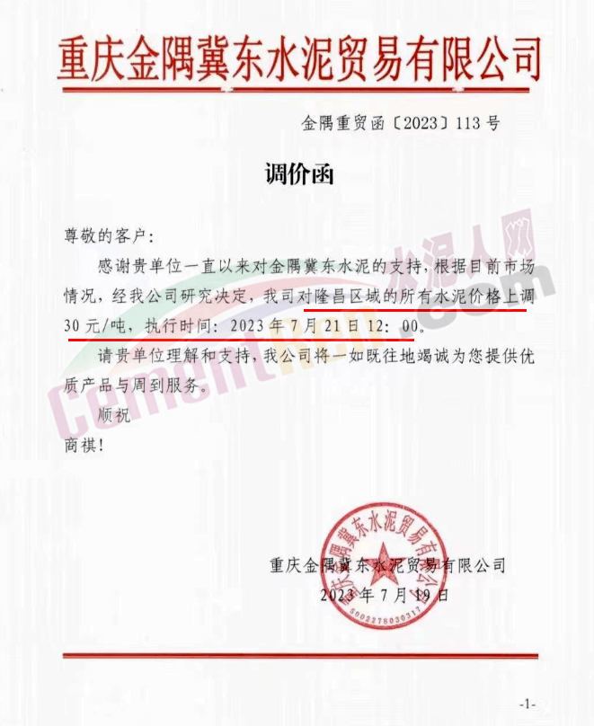 近日重慶金隅冀東水泥貿(mào)易有限公司根據(jù)目前市場情況,經(jīng)公司研究決定,對隆昌、富順區(qū)域的所有水泥價格上調(diào)30元/噸,執(zhí)行時間分別為2023年7月21日12時和16時。