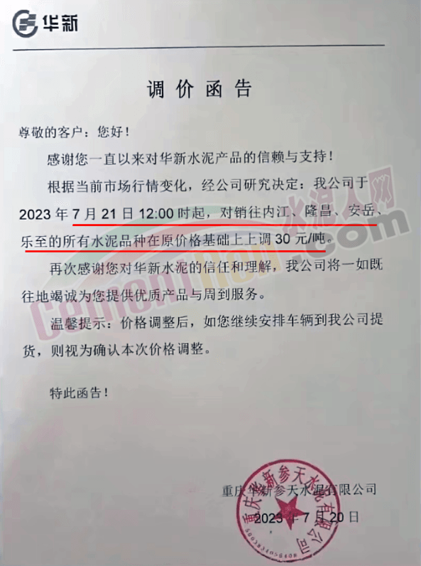 重慶華新參天水泥有限公司通知,根據(jù)當(dāng)前市場行情變化,經(jīng)公司研究決定,公司于2023年7月21日12時起,對銷往內(nèi)江、隆昌、安岳、樂至的所有水泥品種在原價格基礎(chǔ)上上調(diào)30元/噸。