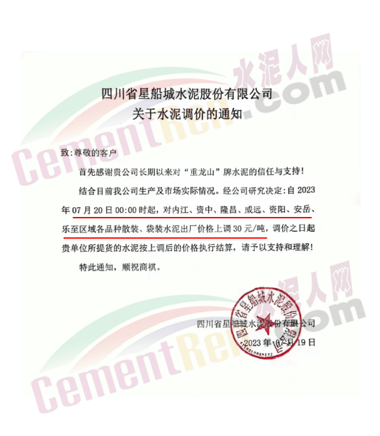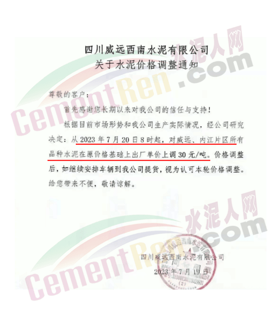 四川資中西南水泥通知,從2023年7月20日8時起,對資陽、樂至、安岳、資中、內(nèi)江、隆昌片區(qū)所有品種水泥在原價格基礎(chǔ)上出廠單價上調(diào) 30元/噸。
