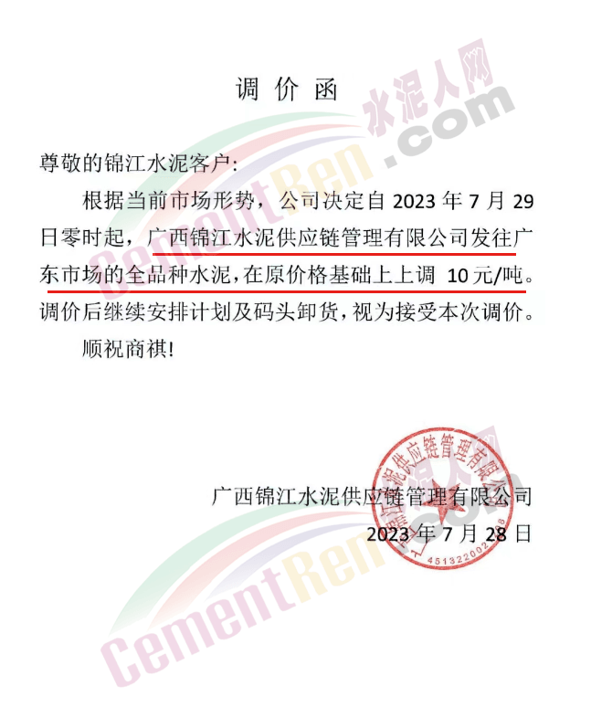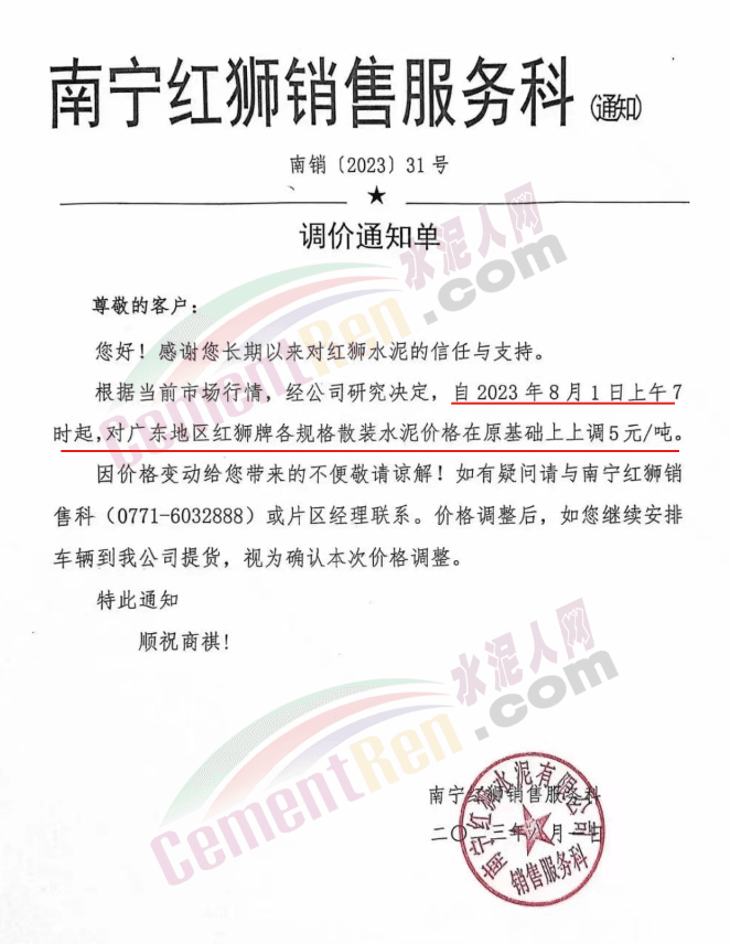 同期,南寧紅獅銷售服務(wù)科通知,根據(jù)當(dāng)前市場(chǎng)行情,經(jīng)公司研究決定,自2023年8月1日上午7時(shí)起,對(duì)廣東地區(qū)紅獅牌各規(guī)格散裝水泥價(jià)格在原基礎(chǔ)上上調(diào)5元/噸。
