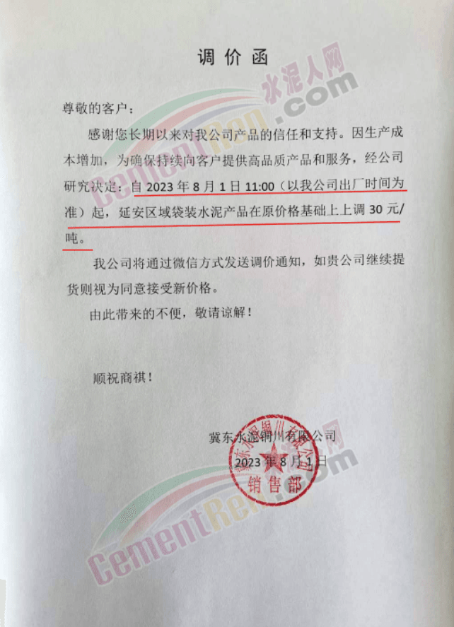 同日,陜西冀東水泥銅川公司通知,因生產(chǎn)成本增加,為確保持續(xù)向客戶提供高品質(zhì)產(chǎn)品和服務(wù),經(jīng)公司研究決定,自2023年8月1日11時(shí)起,延安區(qū)域袋裝水泥產(chǎn)品在原價(jià)格基礎(chǔ)上上調(diào)30元/噸。