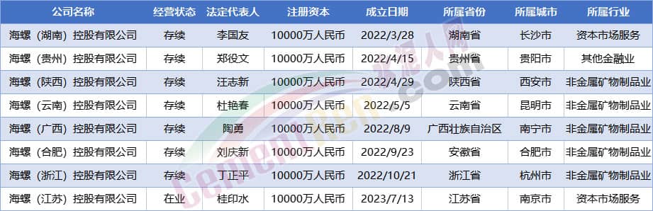 據(jù)查詢,近兩年,海螺水泥先后成立7家區(qū)域控股有限公司,注冊(cè)資本均為1億元。涉及湖南、貴州、陜西、云南、廣西、安徽、浙江等多個(gè)省市地區(qū),所屬行業(yè)分別為資本市場(chǎng)服務(wù)及非金屬礦物制品業(yè)。