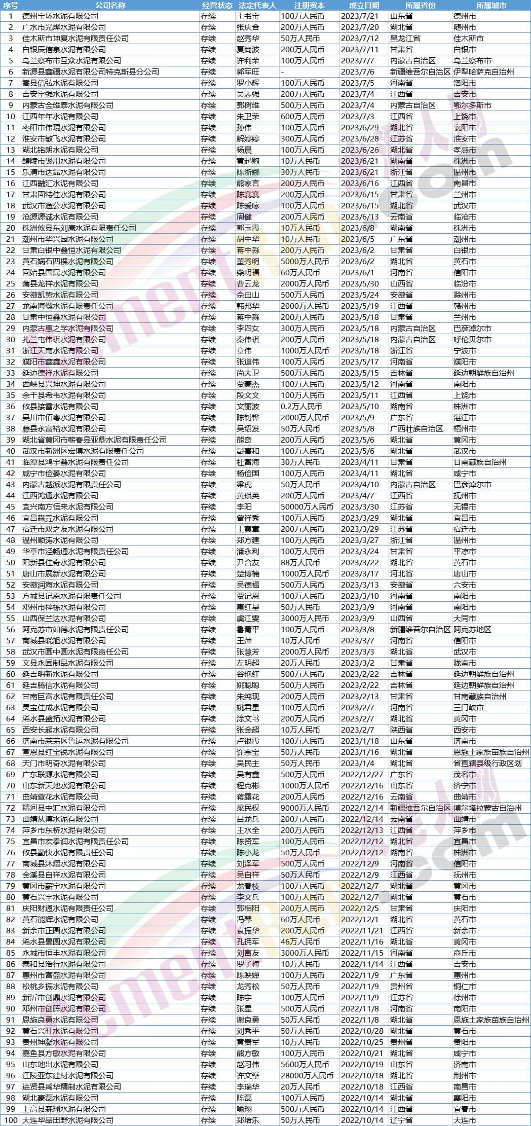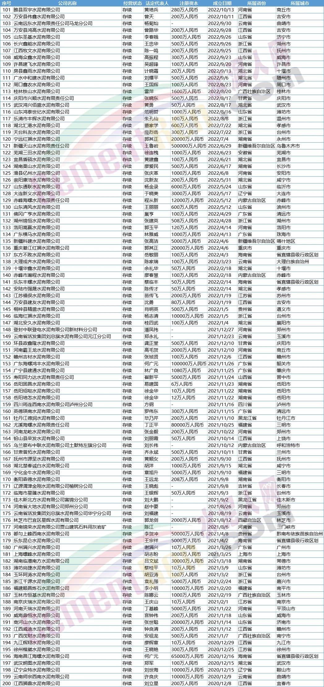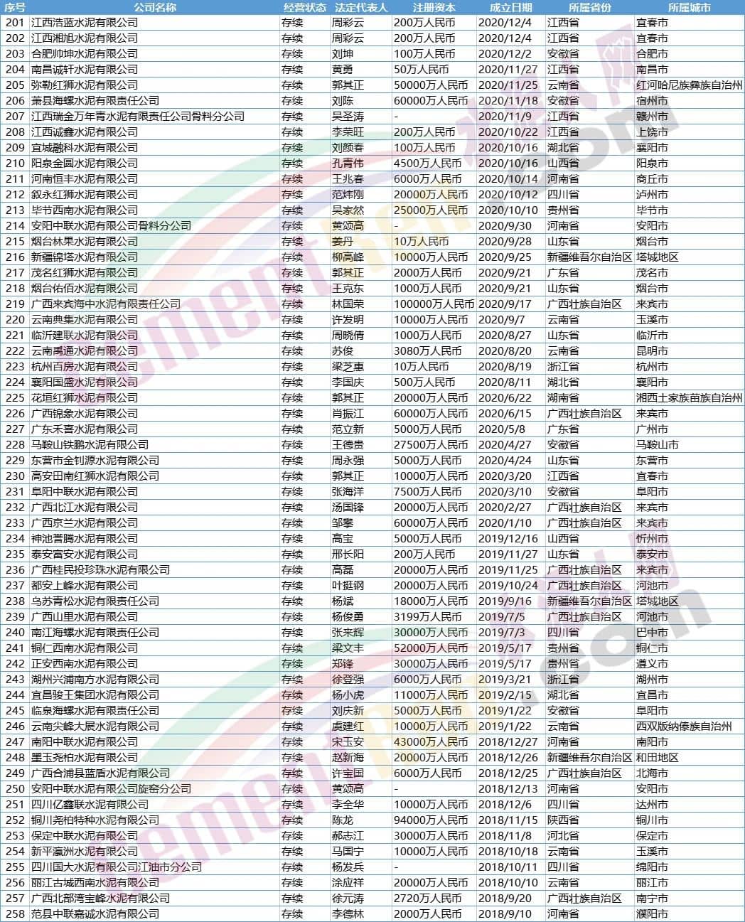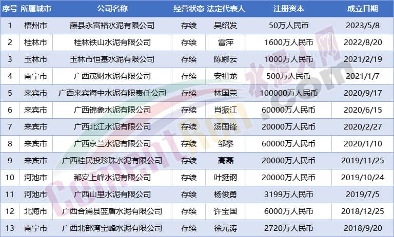 水泥人網(wǎng)注意到新成立企業(yè)中包含近年來(lái)新增產(chǎn)能較大的廣西區(qū)域,新成立企業(yè)包含知名企業(yè)廣西來(lái)賓海中水泥有限責(zé)任公司、廣西錦象水泥有限公司、廣西北江水泥有限公司、廣西京蘭水泥有限公司、都安上峰水泥有限公司等13家水泥公司。