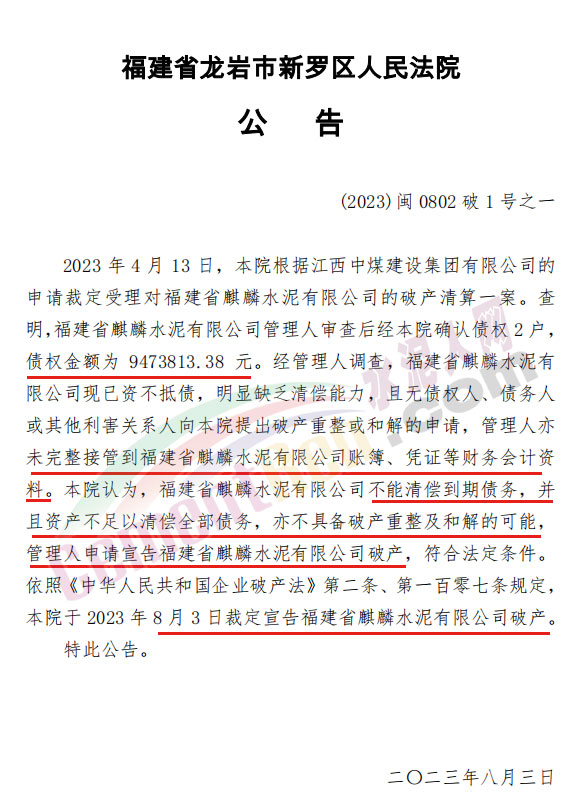 8月3日,福建省龍巖市新羅區(qū)人民法院發(fā)布公告稱:2023年4月13日,根據(jù)江西中煤建設集團有限公司的申請裁定受理對福建省麒麟水泥有限公司的破產清算一案。