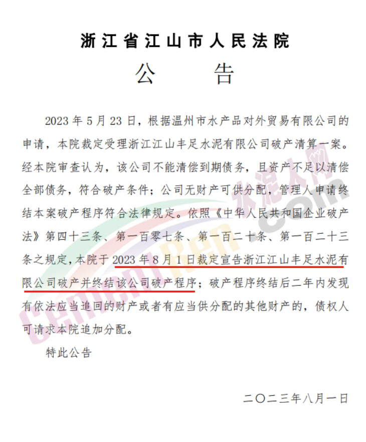 8月1日浙江省江山市人民法院發(fā)布公告稱,2023年5月23日,根據(jù)溫州市水產品對外貿易有限公司的申請,裁定受理浙江江山豐足水泥有限公司破產清算一案。