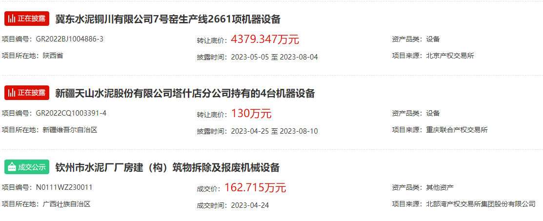 另有包含華潤水泥、冀東水泥、萬年青水泥在內的4家品牌企業(yè)公開出讓企業(yè)股權;包含行業(yè)知名企業(yè)蕪湖海螺水泥在內的兩家企業(yè)公開出讓土地使用權;包含天山水泥、中聯(lián)水泥、南方水泥、北方水泥、冀東水泥在內的14家企業(yè)公開出讓熟料生產線、熟料指標、房屋建筑物、構筑物及機器設備等資產。